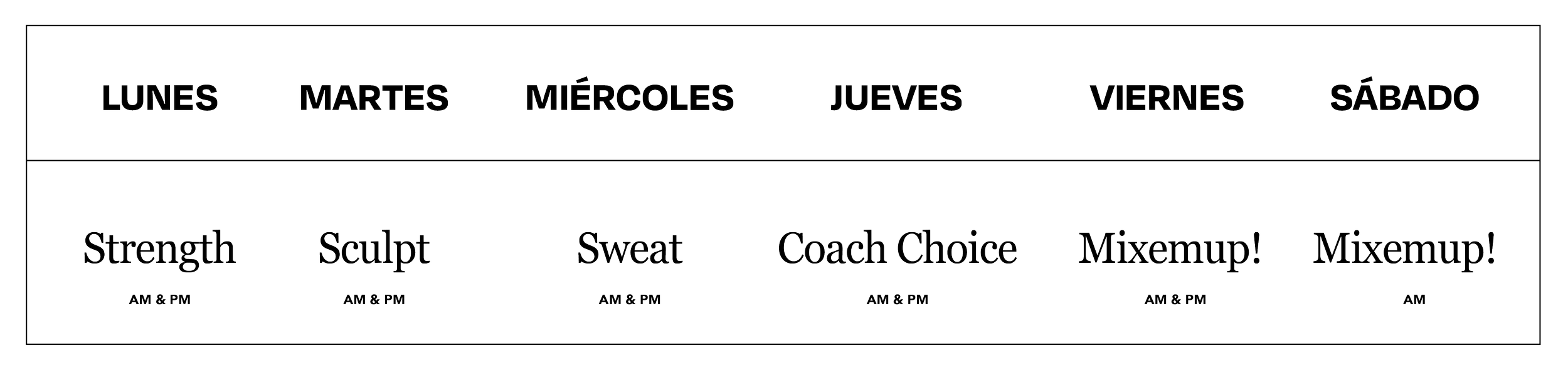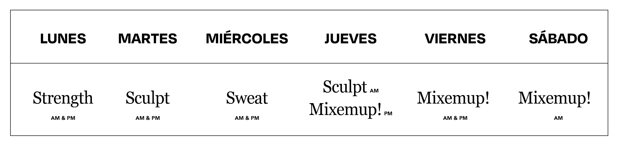 Programa: Ninguna clase es igual a otra. Nuestro programa semanal varía de acuerdo a cada día (consulta programa ↑), combinando diferentes estímulos y enfoques para un trabajo integral del cuerpo. A lo largo de la semana encontrarás clases STRENGTH (lunes), SCULPT (martes y jueves am), SWEAT (miércoles) y MIX EM UP (jueves pm, viernes y sábado), cada una con una intención y estructura específica, diseñadas para complementarse entre sí y adaptarse a distintos niveles y objetivos.